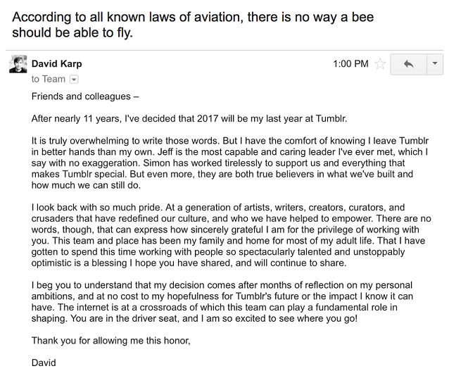 “David Karp will depart Oath by the end of the year,” reads a quote from the official Oath announcement. “David founded Tumblr 10 years ago as a space for the world’s creators, and we thank him for his commitment and passion driving the growth of the platform to almost 380 million blogs and over 155 billion posts.”