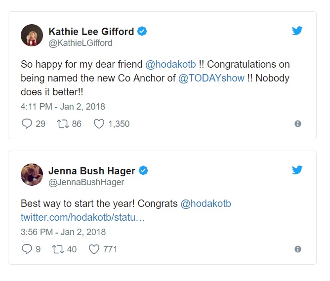 Fellow "Today" co-hosts contributors tweeted their congratulations Tuesday:
